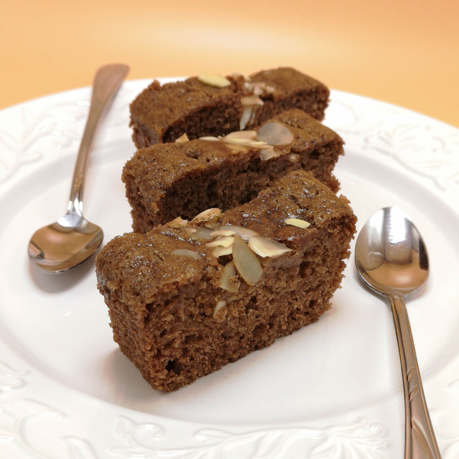 A cinnamon loaf cake topped with sliced almonds and white chocolate swirls decor.